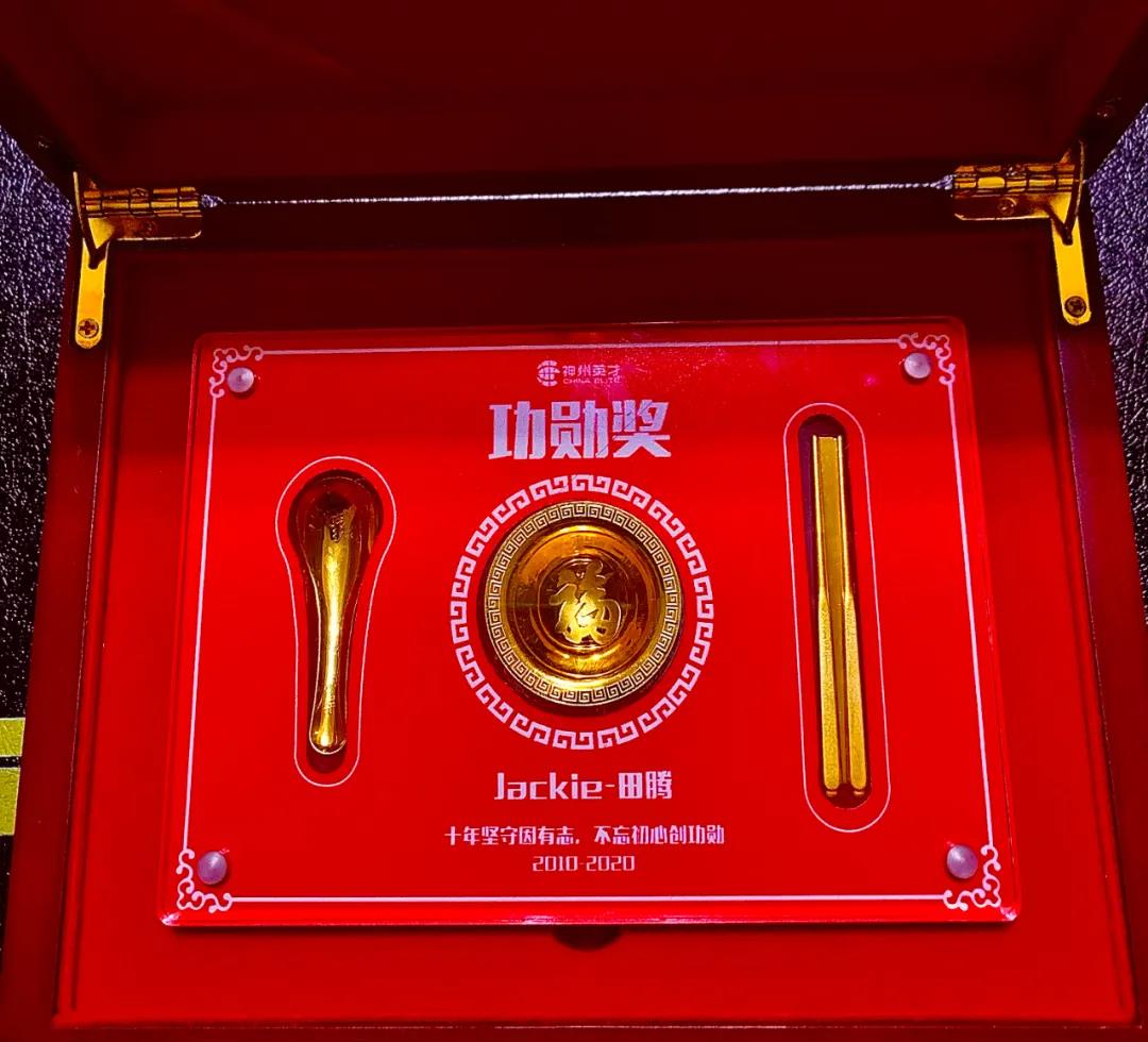 “怀梦十年,立志功勋” 恭喜你,在过去十年收获了成长恭喜你,在今天收获了功勋奖 十年“功勋”的纪念,是一副定制的金碗筷,愿你在未来的时光里,和神州英才一起成就更多的伙伴,帮助更多的伙伴收获“金饭碗”。