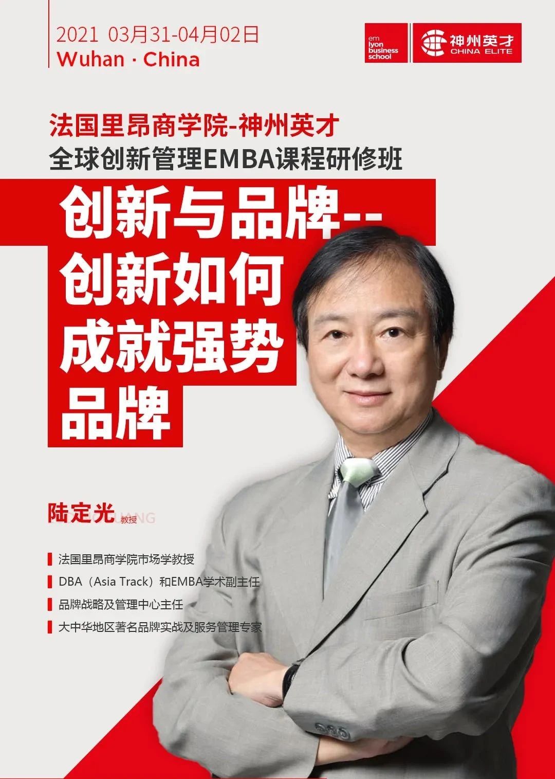 4月1日-2日为期两天的课程,将由法国里昂商学院市场学教授,DBA(Asia Track)和EMBA学术副主任,品牌战略及管理中心主任,大中华地区著名品牌实战及服务管理专家陆定光教授主讲,《创新与品牌—创新如何成就强势品牌》。