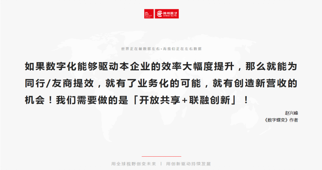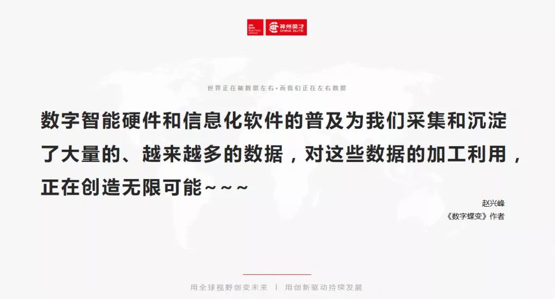 “颠覆,DT让企业更聪明,改变着企业生存方式、商业模式、思考方式”,“数据技术趋向成熟、平民化让数据资产成为新生产要素和竞争要素,更高维度竞争优势”,“无论经济环境、还是社会人文环境、还是技术环境变化越来越快,不确定性成为常态。"