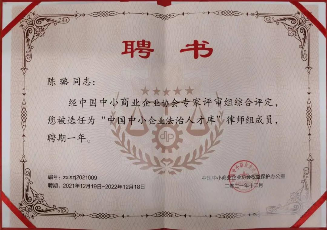 2021年12月14日,中国中小商业企业协会公示“中国中小企业法治人才库”名单,神州英才首席法律顾问陈璐律师入选在列。 此次征选由中国中小商业企业协会发起,是在深入学习贯彻习近平法治思想,应对现阶段中小微企业的法治营商环境及法律服务需求,适应《民法典》颁布带来的系列法律变化,维护中小企业及企业家的合法权益,依法平等保护各类企业合法权益,为中小企业发展营造良好的法治环境的大背景下,由中国中小商业企业协会在全国范围内征选优秀法学法律专家加入“中国中小企业法治人才库”。