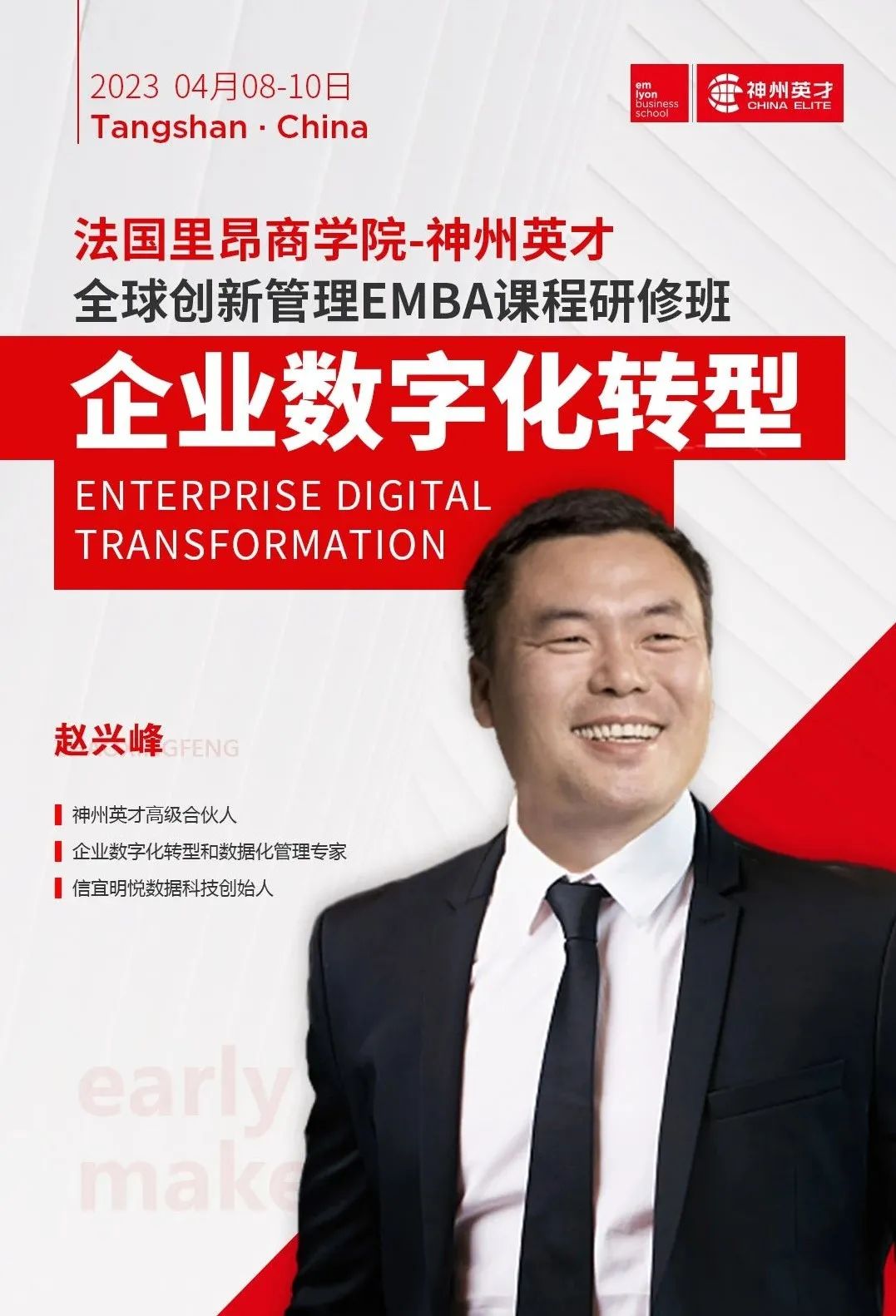 ![]() 课程将围绕数字化转型的本质与底层技术逻辑,通过讲解企业数字化转型常见的陷阱和难题,分析典型场景案例和数字化转型战略规划方法,带领学员们走上数字化转型变革之路。 智能终端越来越普及,颠覆了人们的生活方式。正如赵兴峰老师在《数字蝶变》中写道:“如果数字化能够驱动本企业的效率大幅度提升,那么就有了业务化的可能,就有创造新营收的机会。中小企业需要做的是开放共享+联融创新。” 时代的考题已经列出,我们的答卷正在写就! 2023年法国里昂商学院-神州英才全球创新管理EMBA课程研修班游学之旅即将启程,咱们在河北迁安,不见不散! |