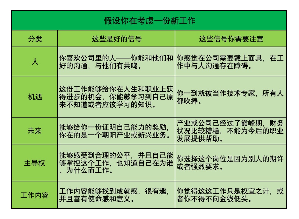 大多数工作都会发出适合你或者不适合你的信号,通过这下边的表,你就能判断出那些是好的信号、哪些是糟糕的信号: