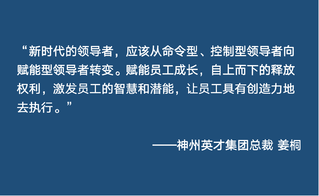关于什么是领导力?神州英才集团总裁姜桐说:“新时代的领导者,应该从命令型、控制型领导者向赋能型领导者转变。赋能员工成长,自上而下的释放权利,激发员工的智慧和潜能,让员工具有创造力地去执行。”