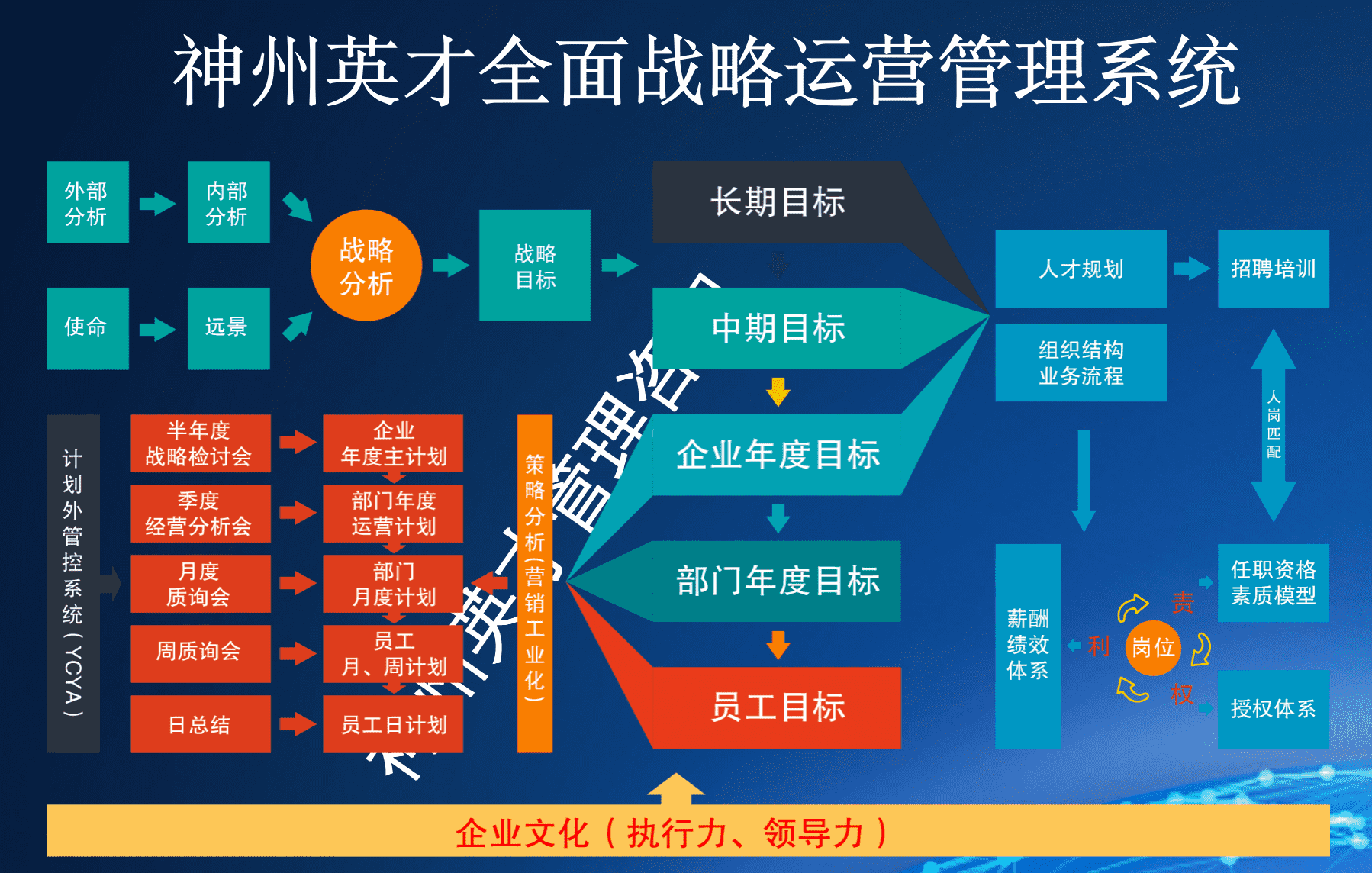 从《全面战略运营管理系统》来看,企业管理系统的七个大方向,即支撑企业发展的企业执行力和个人领导力,以及管理者需要具备的五项大系统:决定企业发展的战略系统、培养人才的人力资源系统、提升凝聚力的企业文化系统、复制销售能人营销工业化系统、提升组织效率的运营管控系统。